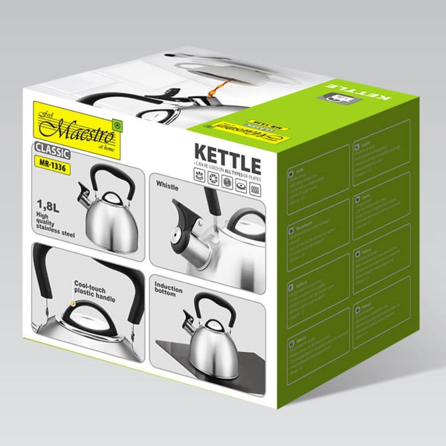 | Kirjeldus | Czajnik tradycyjny Maestro MR-1336 o pojemności 1,8 litra to idealne rozwiązanie dla każdego miłośnika herbaty i kawy. Wykonany z wysokiej jakości stali nierdzewnej, zapewnia nie tylko estetyczny wygląd, ale również trwałość i odpo |