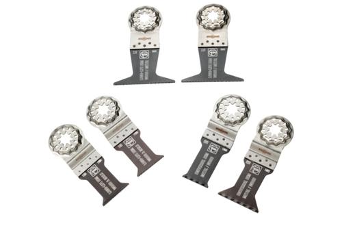 6 E-Cut plunge-cut saw blades for sawing in wood and metal. Suitable for all FEIN MultiTools and all other common MultiTools on the market. Available as a set, offering significant savings over purchasing the items individually. Content: E-Cut long-life saw blades (2 each of 50 x 35 mm, 50 x 65 mm), E-Cut universal saw blade (1 each of 55 x 28 mm, 55 x 44 mm).FEIN Best of E-Cut SL. Type: Plunge cut blade, Suitable for materials: Metal, Wood. Quantity per pack: 6 pc(s)