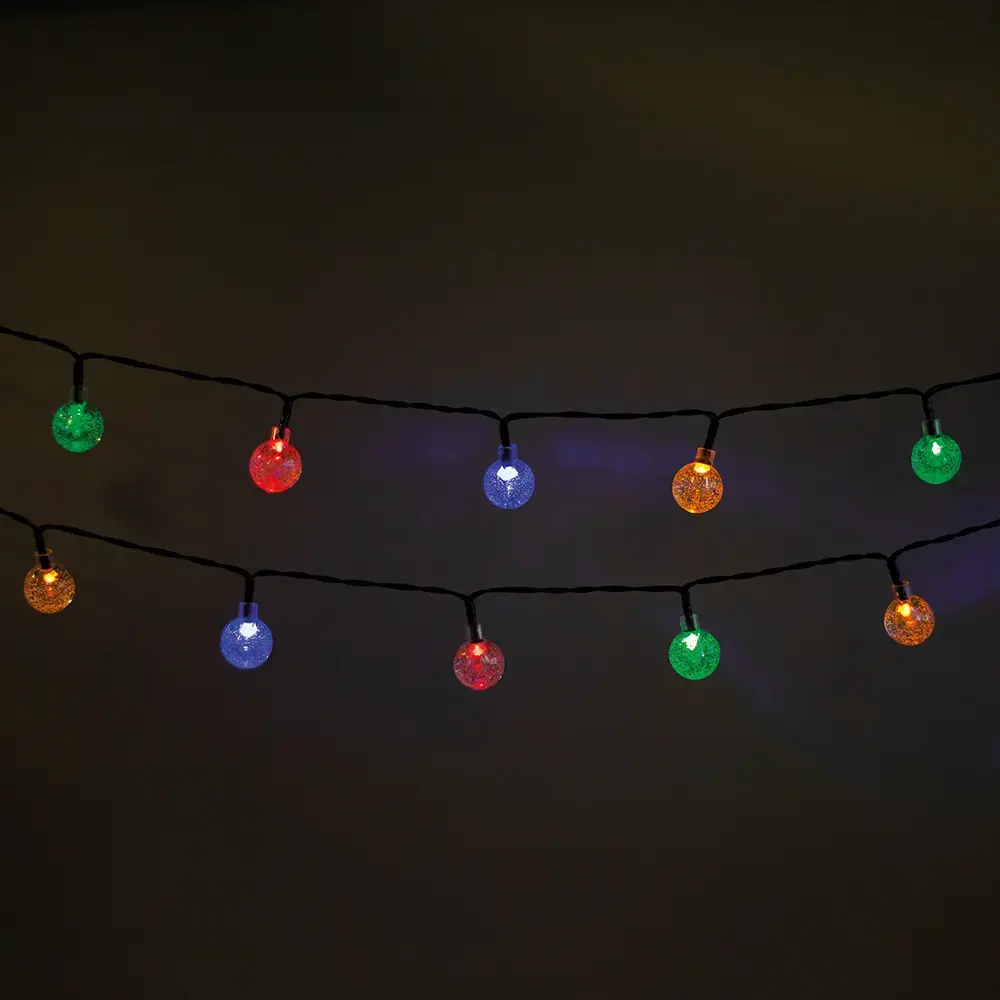 Delicate solar string of light with colored LEDs with a cover made of transparent balls is a product resistant to impacts and external conditions. The balls emit elegant, colorful light creating a unique atmosphere.