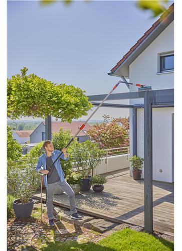 The GARDENA Handle Flex enables an extra 53 cm of reach when cleaning. This makes cleaning higher horizontal surfaces such as patio or carport roofs child's play. Aids such as a ladder can be dispensed with in future. The handle is made of top-quality, sturdy aluminium and has a coating that is pleasant to the touch.