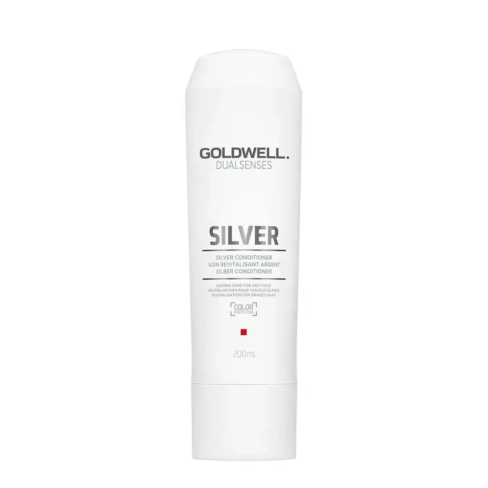 Blended with microPROtec complex and Luminescine, Goldwell Dualsenses Silver Conditioner helps to neutralise unwanted yellow tones and instantly refines a cool effect whilst detangling your hair. This innovative silver conditioner transforms non-visible UV light into visible light for luminosity and brilliant colour restuls. Ingredients: Water/Aqua/Eau, Cetearyl Alcohol, Isopropyl Myristate, Cetrimonium Chloride, Potassium Phosphate, DisodiummPhosphate, Panthenol, Ethylhexylglycerin, Lactic Acid, Glycerin, Sodium Hydroxide, Ethylhexyl Methoxycinnamate, Octyldodecyl PCA, Disodium Distyrylbiphenyl Disulfonate, Sodium PCA, Hydrolyzed Verbascum Thapsus Flower, Sodium Chloride, Tocopherol, Glycoproteins, Salix Nigra (Willow) Bark Extract, Phenoxyethanol, Sodium Benzoate, Potassium Sorbate, Fragrance/Parfum, Limonene, Linalool, HC Blue No. 12, Acid Blue 9, Acid Violet 43, CI 17200, CI 19140. | Goldwell Dualsenses Silver Conditioner 200Ml In Clear.
