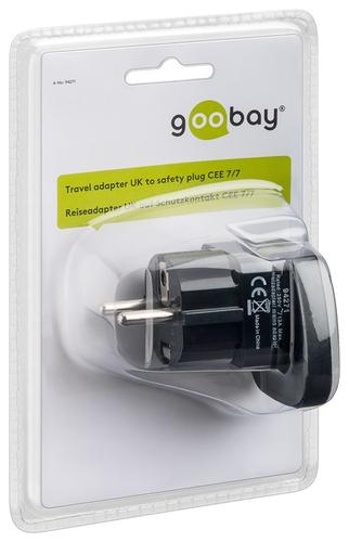 UK socket > safety plug (type F, CEE 7/7)Goobay Travel Adapter UK to EU, Black. Plug connector type: Type F, Socket connector type: Type G (UK), Connector 1 form factor: Straight. Width: 50 mm, Depth: 47 mm, Height: 51 mm. Package type: Blister