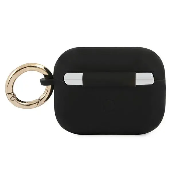 GUESS Silicone Cover. The silicone case protects the Apple AirPods Wireless Earphone Dock from surface damage and possible loss. The high-quality silicone case perfectly matches the original AirPods Pro case and is extremely pleasant to the touch. The whole thing is complemented by the distinctive golden Guess logo which makes the case elegant. On the side of the case there is a practical, gold ring that allows you to attach the case to a lanyard, for example.