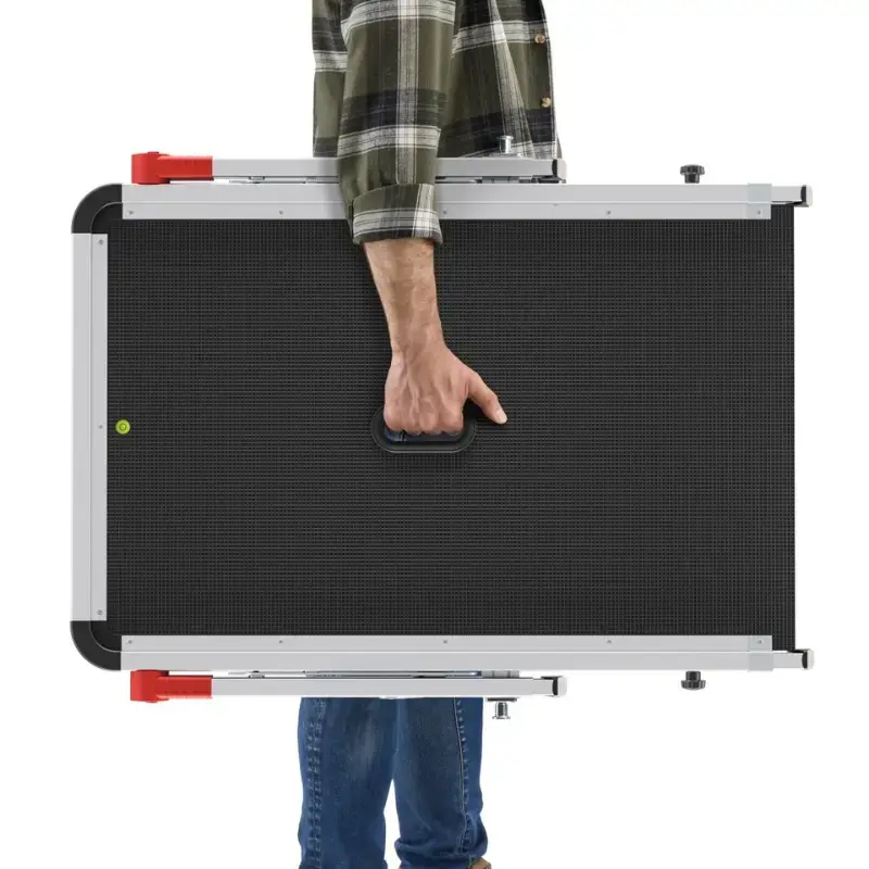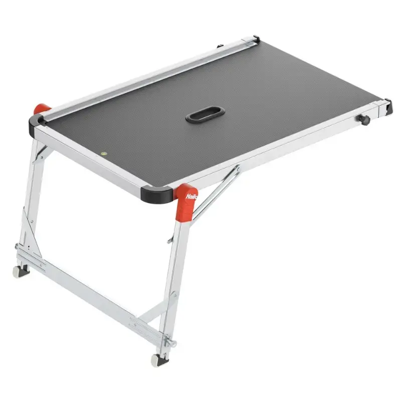 An innovative and safe solution for renovating and decorating. Can be used as a working platform or as a base for other folding stairs. The length and height of the platform legs can be easily adjusted depending on the step height and floor covering. It is easy to carry thanks to the 2 handles integrated in the platform.Suitable for all HAILO folding steps with supports and staircases up to 4 stepsSuitable for professional useSoft-Grip handleWork platform with ribbed coating for stabilityRobust aluminium frameTwo-hand safety release systemEasy to useIncludes a system to check that the platform is in a safe horizontal position4 legs with Soft-Grip insoles provide stability and slip protection on a variety of floor surfacesMax. lifting capacity: 150 kg Weight: 9,0 kg