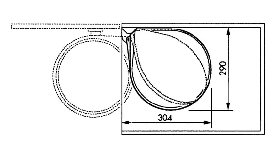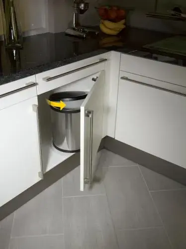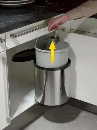 - Compact size with 15 L capacity. Can be mounted on the left or right side of the door and also used for lower cabinets with swing doors at least 40cm wide.