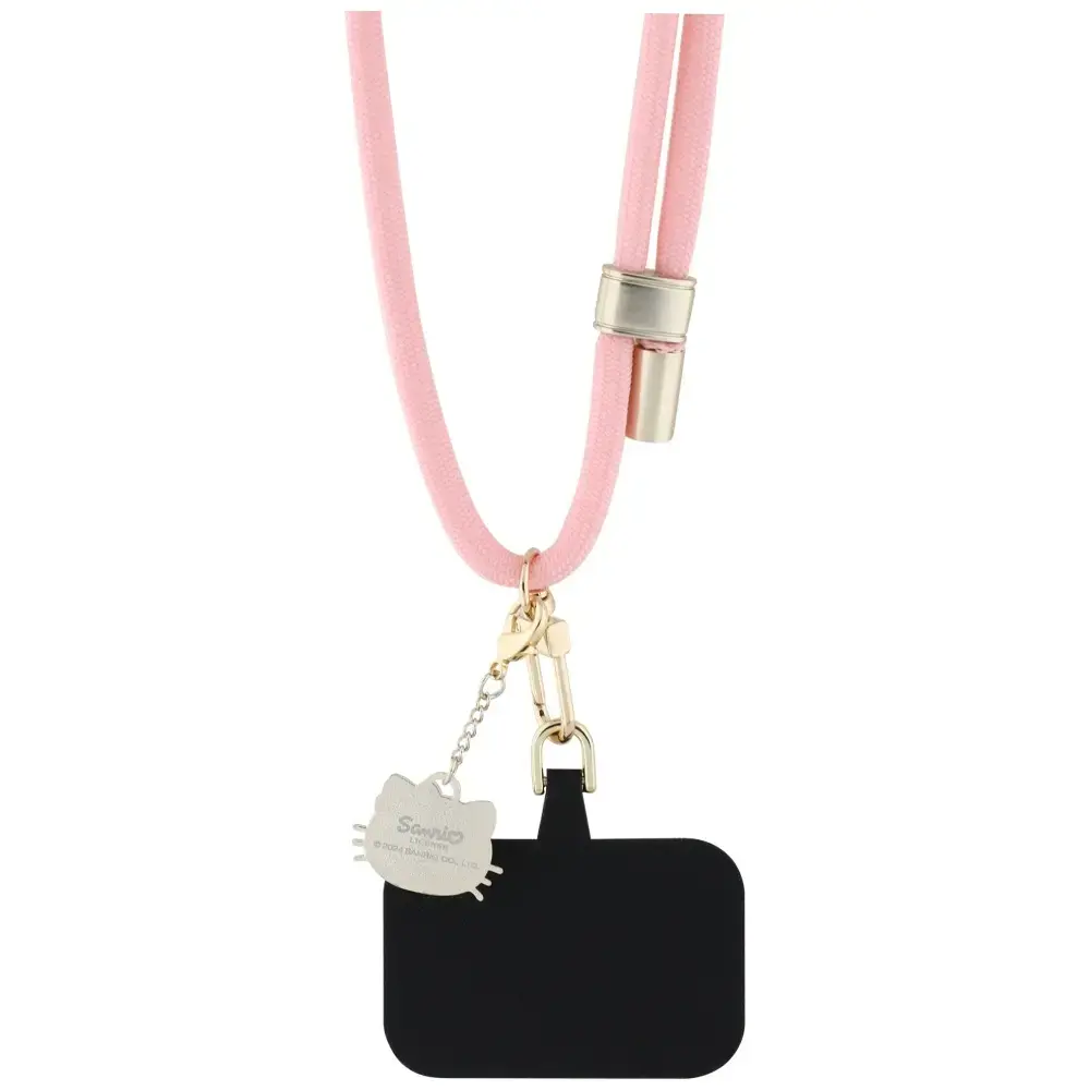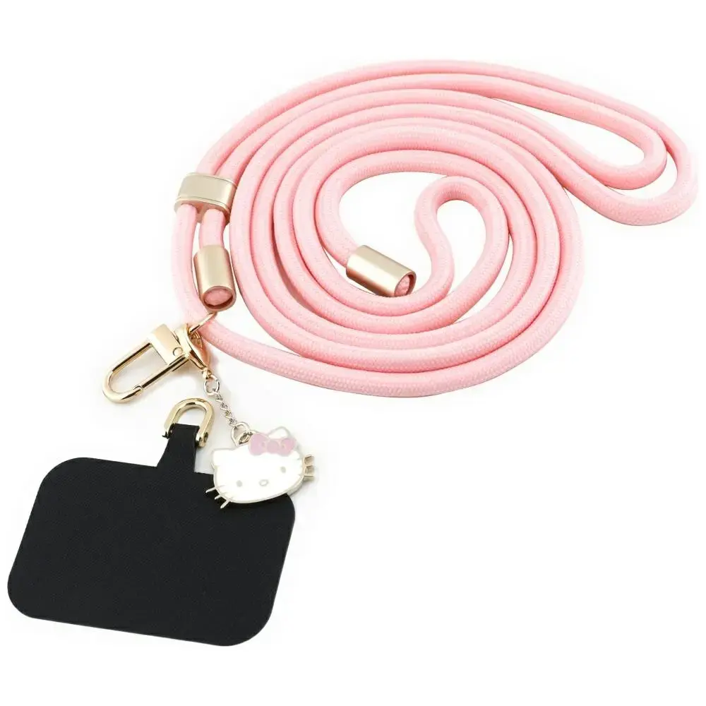 The adjustable nylon strap is compatible with most phone cases. It allows wearing the phone on your shoulder, neck, or hand. At the end of the strap, there is a cute charm representing Hello Kitty with a bow on her head.