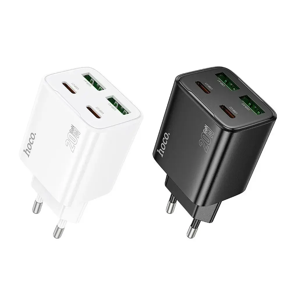 Hoco N55 wall charger with fast charging function and quadruple output. Allows you to quickly charge mobile devices. The charger is equipped with quadruple output: 2 USB-C (20W) and 2 USB-A (20W), allowing you to charge 4 devices simultaneously. The product supports PD20W / PPS / QC3.0 / QC2.0 / FCP / AFC / SCP fast charging and other fast charging protocols. Made of PC, the charger is exceptionally durable and resistant to damage. Intelligent recognition allows you to match the current intensity to your device, ensuring safe use. Specifications: