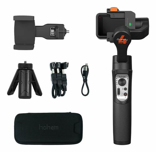 iSteady Pro 4 is compatible with GoPro Hero 11/10/9/8/7/6/, DJI OSMO Action, Insta360 ONE R (4K & 1-Inch), and other action cameras with similar size. Hohem iSteady Pro4. Type: Sport action camera stabilizer, Material: Composite, Product colour: Black. Battery capacity: 3600 mAh, Operating time: 14 h, Charging time: 3.5 h. Weight: 365 g. Cables included: Micro-USB, USB