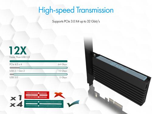 The current M.2 NVMe SSDs achieve more than five times the speed of traditional SATA SSDs. This enormous power naturally generates a lot of waste heat on the small M.2 cards. In order to protect the card and the system, the speed is throttled if the SSD heats up too much. The IB-PCI214M2-HSL offers enough cooling power with the enclosed heat conduction pads and the large heat sink so that you can enjoy the full power of your M.2 SSD at all times.