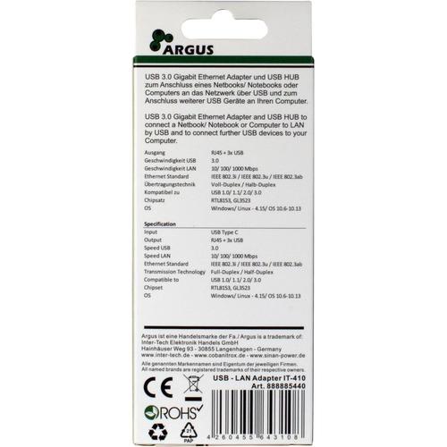 Inter-Tech ARGUS IT-410. Host interface: USB 3.2 Gen 1 (3.1 Gen 1) Type-C. Networking standards: IEEE 802.3ab, IEEE 802.3i, IEEE 802.3u. Product colour: Black, Hub interfaces: RJ-45, USB 3.2 Gen 1 (3.1 Gen 1) Type-A, Housing material: Aluminium. Windows operating systems supported: Windows 10, Windows 7, Windows 8, Windows 8.1, Mac operating systems supported: Mac OS X 10.6 Snow Leopard. Width: 28 mm, Depth: 270 mm, Height: 20 mm