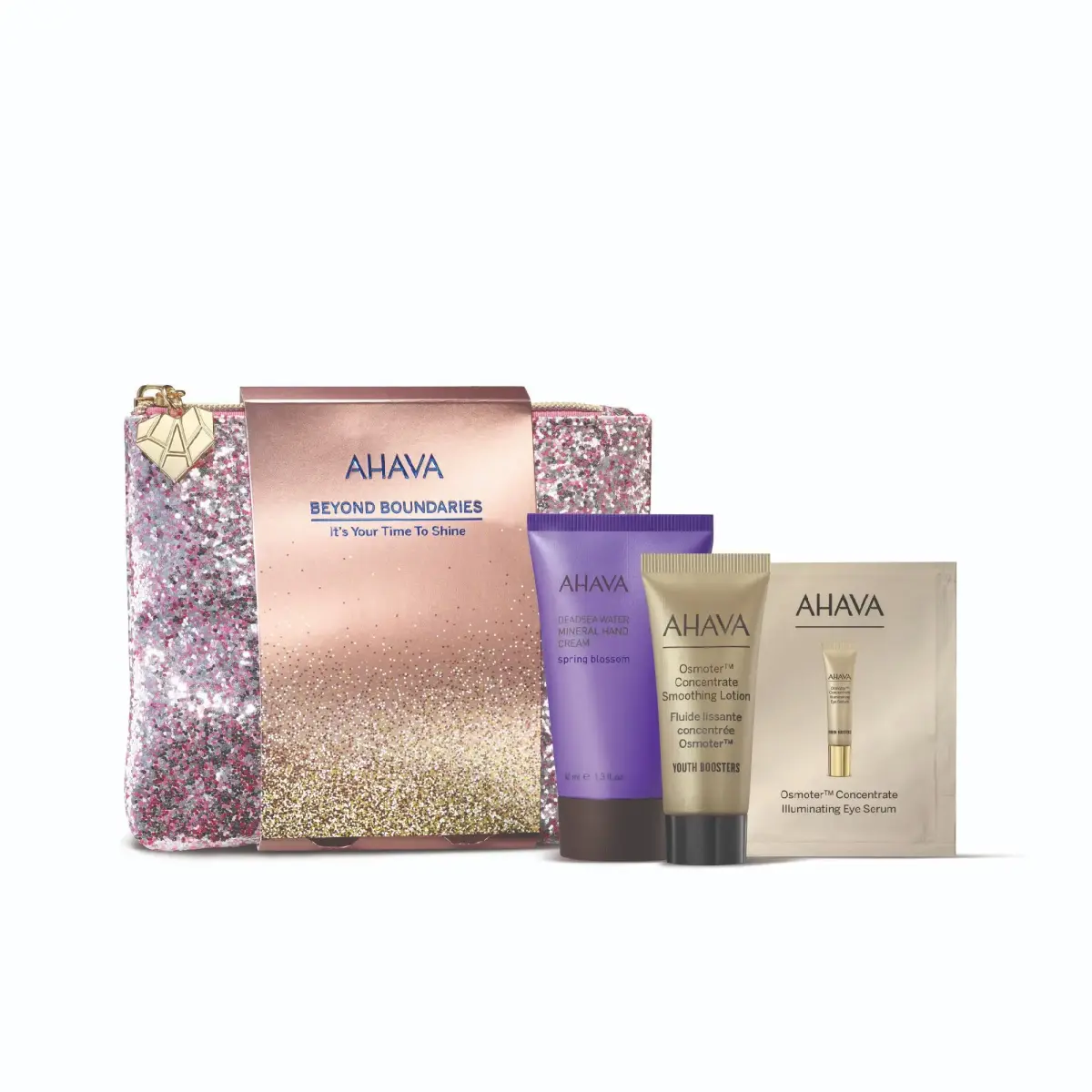 Ahava Sinu aeg särama! Komplektis: Osmoter kontsentraat, siledus, kreem, näole, 15 ml + Osmoter kontsentraat, valgustus, silugeel, 2 ml *proov + Merikristalli mineraalne, niisutus, käokreem, lilleline, 40 ml + GWP tekstiilist kott (697045016945)