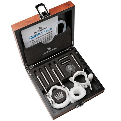 Our best-selling product, the Jes Extender Original comes in a stylish mahogany case. It comes with a front piece comfort strap, transparent silicone tube, set of keys, access to an online instructional video and 2-year warranty. Suitable for penis sizes up to 24cm (9.1 inches).