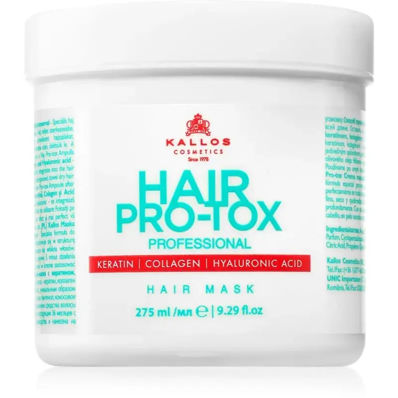 Kallos Hair Pro-Tox, 275 ml, Hair Masks for Women, Do you feel that your hair needs more intensive care than conditioners or balsams can provide? A hair mask from KallosHair Pro-Tox will perfectly enrich your hair care routine. Thanks to its high concentration of nourishing ingredients aimed at tackling specific problems, it restores vitality and beauty to your hair. It penetrates deep into the hair fibres to strengthen them, nourish them intensively, promote their regeneration and smooth their surface, leaving them beautifully soft to the touch, radiantly shiny, but also more resilient to damage. Characteristics: moisturises intensely regenerates the hair along its entire length strengthens the hair fibre restores hair structure goes deep into the hair fibre hair is soft to the touch gives hair a brilliant shine How to use: Wash with shampoo, then apply to damp hair. Leave to act as instructed on the packaging, then rinse thoroughly.