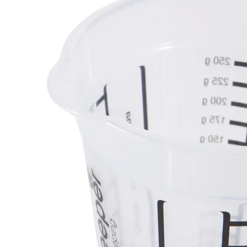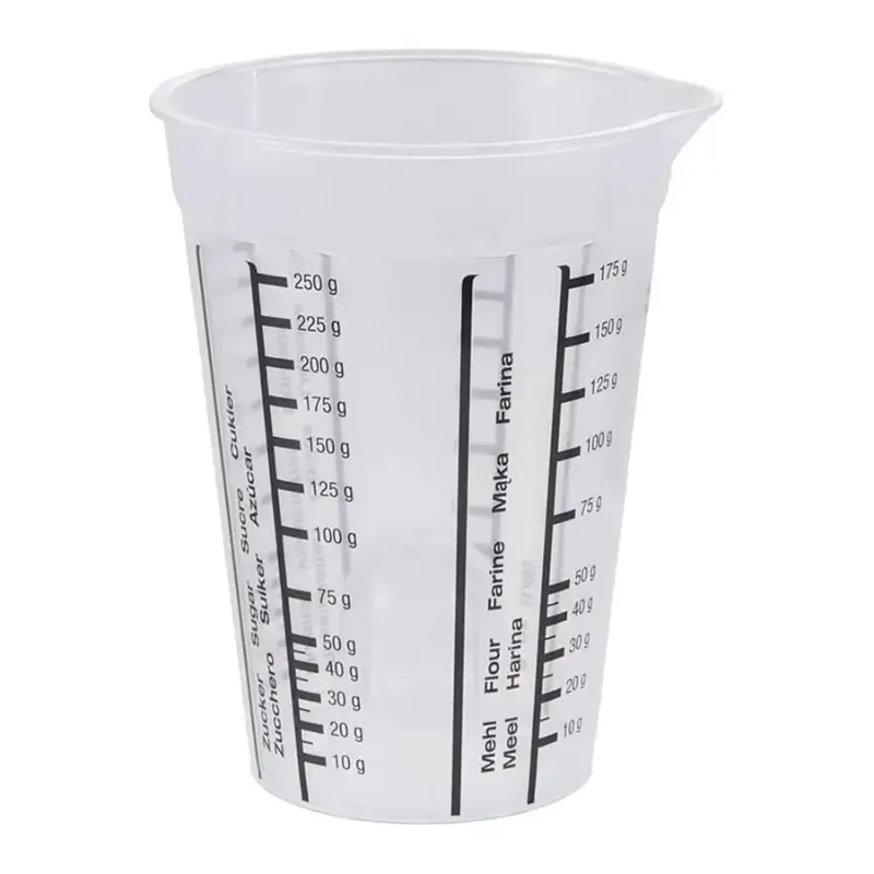 Conveniently shaped measuring cup in an elegant design made of durable plastic. The easy-to-read transparent measuring scale measures flour, sugar and liquids with ease. International units such as fluid ounces can also be measured - ideal for anyone who likes original recipes. With this measuring cup, no complicated calculating of units is necessary. with different measuring scales (for flour, sugar, liquids, ounces)Handy spout for pouring liquidsmade of durable and food-safe plasticCapacity: 250 mlSize: 8,5 x 8,5 x 11,5 cm