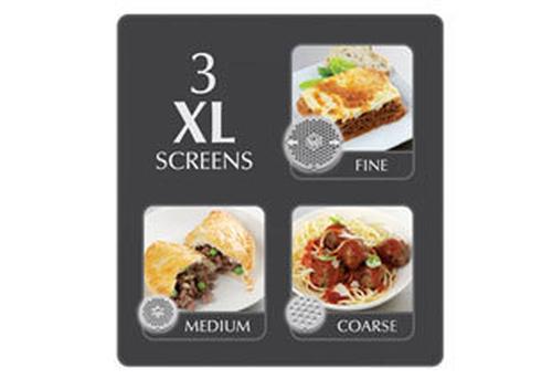 Includes 3 screens (fine, medium & coarse) and a sausage/kebbe maker attachment.Kenwood MG510. Power: 1600 W, Product colour: Aluminium. Weight: 5.32 kg. Dimensions (WxDxH): 210 x 265 x 345 mm