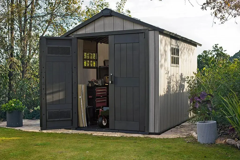 The extremely spacious Oakland 7511 shed is suitable for people looking for modern, functional and stylish solutions for their garden. The spacious interior allows for shelving, storage cabinets and tool racks, as well as storage for large equipment and garden accessories. The double wall panels are made from a unique resin composition, which creates a high quality material that is resistant to adverse weather conditions. The solid roof and reinforced steel construction guarantee a long service life. Thanks to the special texture of the walls, the shed can be painted in any colour.Super strong, made of resin composite material, and rigid with double wall structure and steel reinforcement. The innovative DUOTECH™ walls, which imitate wood, add a touch of glamour. DUOTECH™ walls are easy to paint, making it adaptable to landscape and design. No special maintenance is required thanks to the weather-resistant construction. Fitted with double doors, and roof ridge with clear plastic for daylight and Victorian style double glazed windows. The shed has a ceiling high enough for an adult to move around comfortably. Easy panel assembly.Suitable for storing heavier items (lawnmowers) due to floor strength.Double walls with steel construction, resistant to adverse weather conditionsUnique DUOTECH™ walls that mimic the texture of woodStrong double doors, two windows and roof ridge with transparent plastic for daylightHeavy-duty floorThe robust roof provides a snow load of up to 100 kg/m2.High ceilingsStainless steel locking system (lock not included)Walls can be painted in the colour of your choiceSize: 229 x 350 x 242cmPacking size: 227 x 132 x 51cmWeight: 191kgBULKY GOODS CAN BE COLLECTED FROM THE SHOP UNTIL 16:00