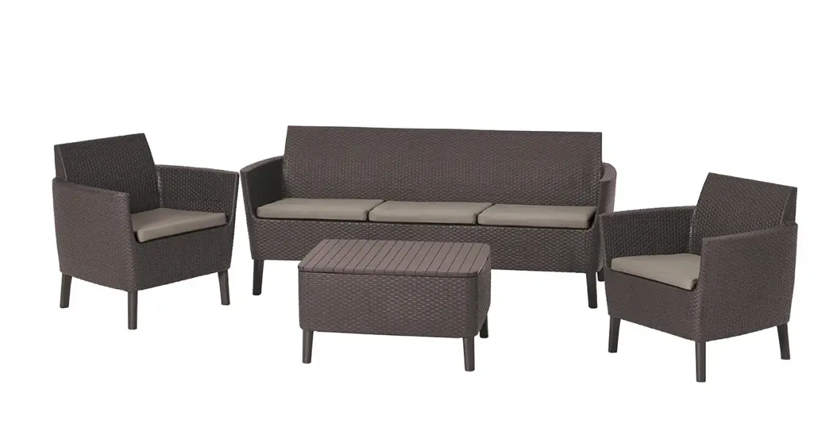 Modern design, elegance and very high comfort are the main features of the large Salemo furniture set. The set consists of a spacious, comfortable double sofa, 3 armchairs and a table with storage function. The furniture is characterised by an original texture that imitates natural rattan. The set will be an ideal element for interior design, garden or terrace furnishing. Very modern furniture, easy to assemble and clean. Resistant to adverse weather conditions and UV radiation.*Furniture is not recommended for outdoor use in temperatures below 0 °C or above 40 °C