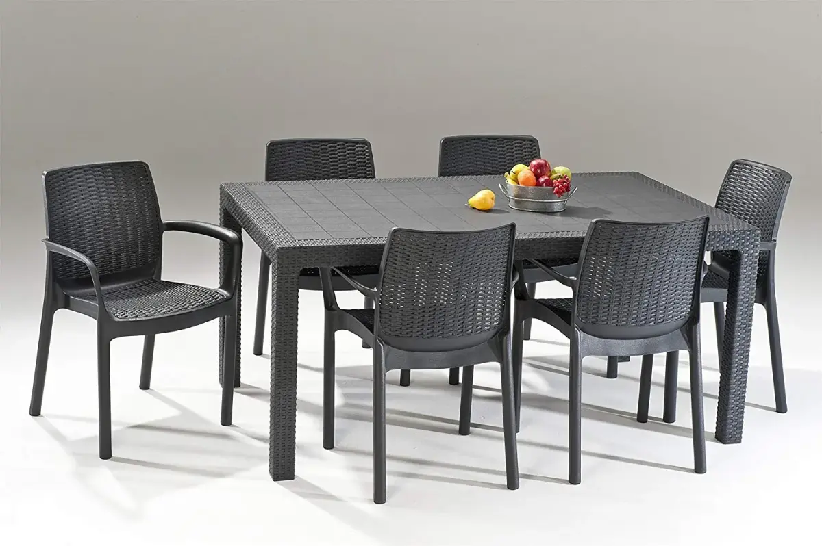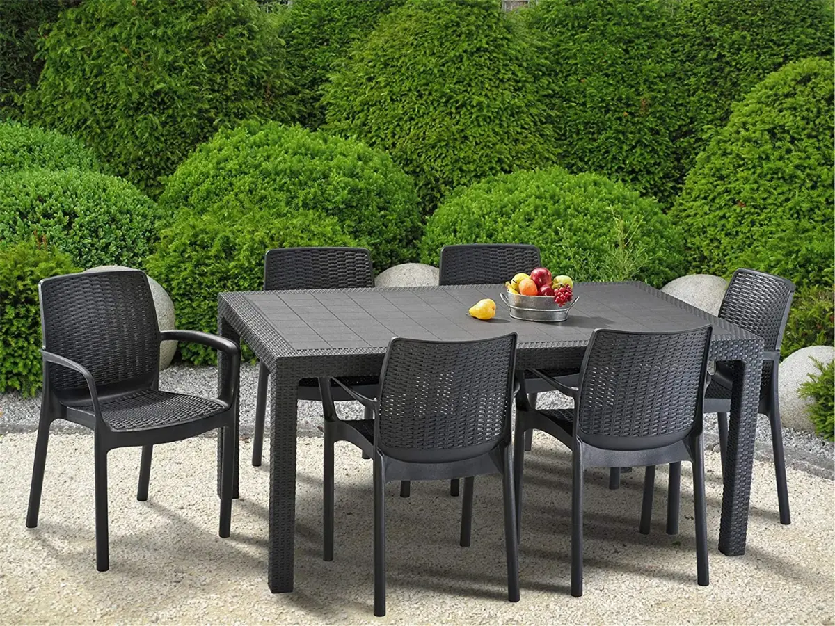 Melody is an elegant and practical garden table that will fit perfectly into larger household spaces such as a terrace or garden.A modern model inspired by rattan furniture. A spacious, rectangular table that can easily and comfortably seat 6 adults.The table is characterised by its high resistance to damage and adverse weather conditions. It is easy to assemble and maintain. Size: 160.5 x 94.5 x 74.5cmPackage size: 160.5 x 94.5 x 9.6cmWeight: 15kg