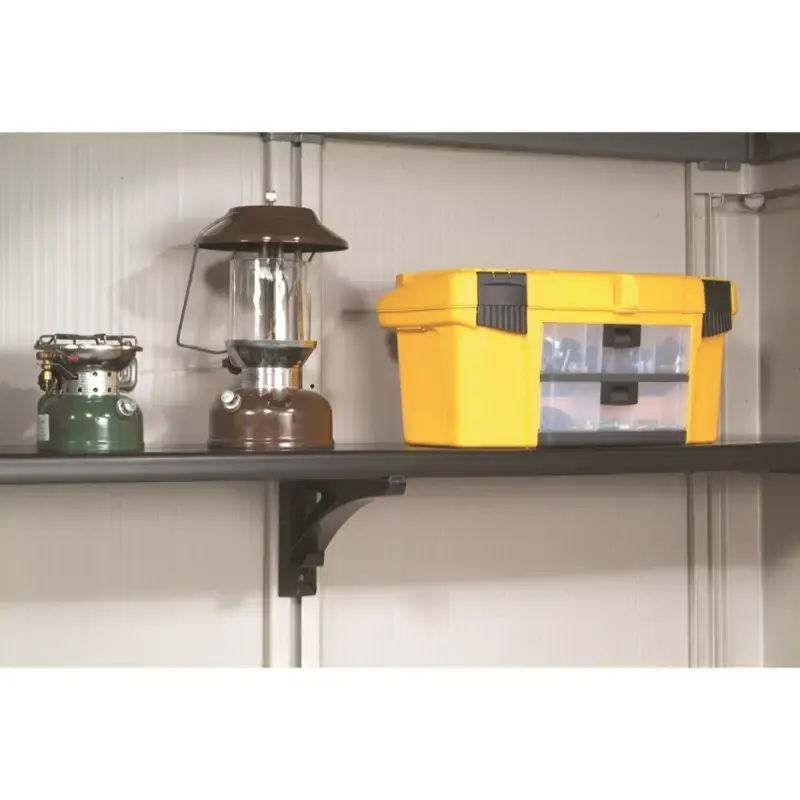 The accessory kit includes 4 shelves and 2 brackets to attach the shelves. The shelf set is suitable for storing and organising various tools and garden accessories.Suitable for Factor 8x11, 8x6, 6x6 and 6x3 sheds.