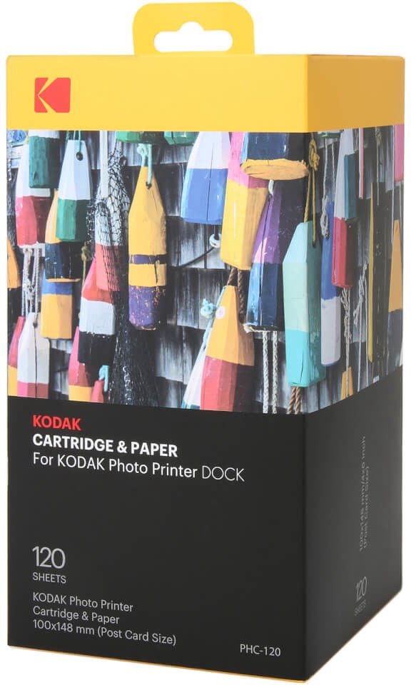Easy Cartridge maintenanceOnly one ink cartridge is needed for all colors.There are color patches rolled inside of the ink cartridge.Simply push the cartridge into the printer. When you finish printing 40 sheets, eject the cartridge by pulling it out with two fingers.Then insert a new cartridge again to resume printing.D2T2 Printing Technology3 colors (Yellow, Magenta and Cyan color) are diffused to the photo paper consecutively.The 4th layer is an overcoating layer that preserves the image quality. Through this laminating process, users do not need to dry photos after printing.Color does not fade and lasts more than 10 years under normal storage conditions. Overcoating Layer KODAK photo printer cartridges have an Overcoating layer within the printing process. This laminating process prevents any damage to the image quality. Photo is finger print and humidity resistant. Good to print Portrait photos D2T2 technology is good for portrait photos compared to any other photo printing technologies. KODAK photo printers are designed to reproduce delicate textures of the human face.Multiple Refill kits available Choose from 40, 80 or 120 sheet refill cartridge packs. Make your choice now! Features Sheets per pack: 120 lapas Compatible products: Kodak Photo Printer Dock Weight & dimensions Height: 148 mm Width: 100 mm