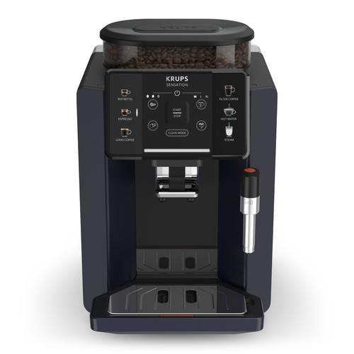 Krups Sensation EA910B. Product type: Espresso machine, Coffee maker type: Fully-auto, Water tank capacity: 1.7 L, Coffee input type: Coffee beans, Reservoir for brewed coffee: Cup, Number of spouts: 2, Built-in grinder. Power: 1450 W. Product colour: Black, Blueberry