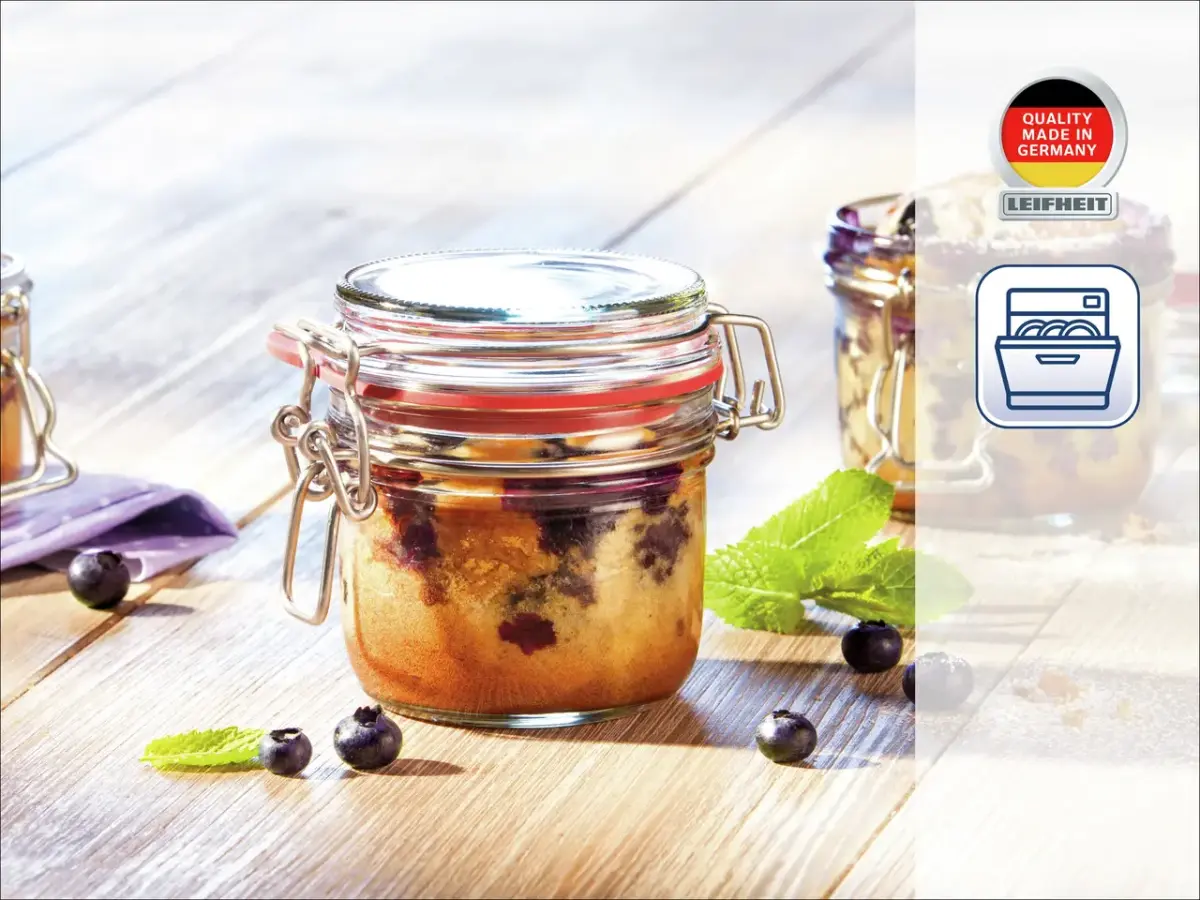 Leifheit jars are not only perfect for preserving in summer, but will be useful all year round. As a gift filled with homemade biscuits or as an original way to serve snacks, store herbs and prepare and serve desserts. With a high-quality clip made of stainless steel, the jar is easy to open and close. The rubber seal ensures safe storage of jams and jellies for a long period of time. Dishwasher safe. Capacity 135 ml. Made in Germany.