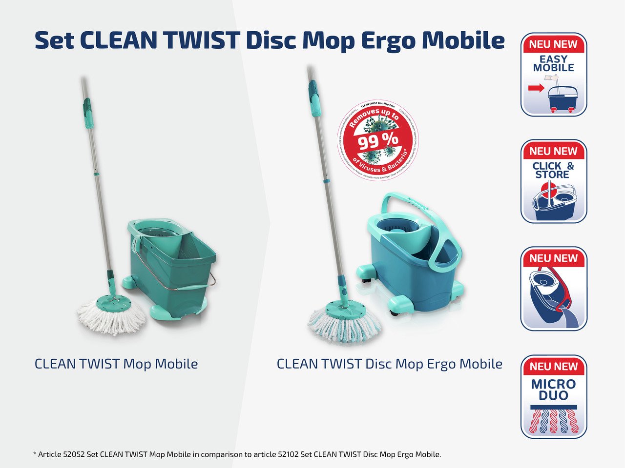 Leifheit Clean Twist Disc Mop Ergo Mobile 52102 on täielik komplekt põrandapesuks, millel on pöörlev hari süsteem, mis on mõeldud kõvade põrandapindade, nagu plaatide, laminaadi, puidu või parketi põhjalikuks puhastamiseks. Komplektis on pöörlev hari mikrofiberkattega, teleskoopkäepide (109–140 cm), 6 l mahutavusega ämber pigaldusmehhanismiga ja liikuv kärurattastega, mis muudab põrandapesu käevaba ja hügieenilisemaks. Patenteeritud pöörlemismehhanism on integreeritud käepidemesse, mis võimaldab hõlpsalt kontrollida hari pea niiskustaset optimaalse puhastustulemuse saavutamiseks. 360° pöörlevad rattad tagavad hõlpsa liikumise mööbli ümber ja nurkadesse. Ühilduv Click Systemi komponentidega ja ideaalne koduseks kasutamiseks