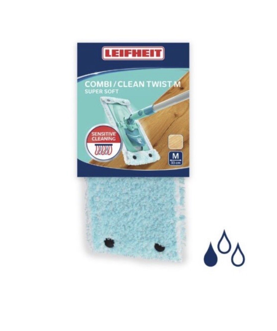 Leifheit Combi M / Clean Twist Super Soft 33 cm is a replacement mop head designed for delicate floor surfaces such as parquet, laminate and cork; the ultra-soft fibres absorb minimal water, glide gently over the floor and effectively pick up dust, while the head fits Combi M and Clean Twist systems, attaches securely, withstands washing at up to 60 °C without losing performance, and offers a working width of approximately 33 cm for smooth and even cleaning.