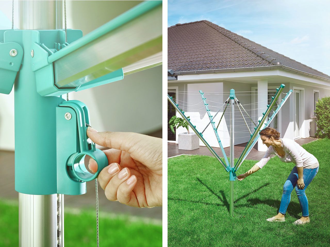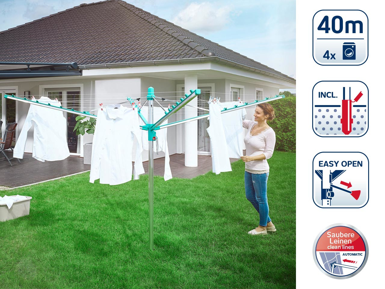 Leifheit Linomatic 400 pesukuivatuskarussell on vÄlja tÖÖtatud spetsiaalselt vÄlitingimustes pesu kuivatamiseks. Õues pesu kuivatamine on energiatÕhus ja riietele jÄÄb meeldiv vÄrske lÕhn. Pesukarussell on kasutamisel mugav ning turvaline. Selle pesunÖÖrid liiguvad kuivataja avamisel ja sulgemisel automaatselt korpuse sisse, mis kaitseb nÖÖre mÄÄrdumise ja ilmastikukahjustuste eest. Puhtad pesunÖÖrid, puhas pesu! Leifheit Linomatic 400 pesukarussell avaneb ja sulgub kerge liigutusega tÄnu Easy-Lift sÜsteemile. Kuivataja avamiseks tÕmmake spetsiaalsest avamisnÖÖrist ning kuivataja tiivakesed avanevad kerge vaevaga. Sulgemiseks vajutage silmade kÕrgusel paiknevat nuppu ning pesukarusselli tiivad sulguvad sujuvalt ja pesunÖÖrid keritakse automaatselt sisse. Avaneb ja sulgub kerge vaevaga, ilma kummardamata ja jÕudu kasutamata. Avatud olekus asetseb avamisel kasutatud nÖÖr turvalises kÕrguses, kus puudub vÕimalus sellele peale astuda, kÕndimisel takerduda ning nÄiteks muruniidukiga Üle sÕita. Kuivatuspinda kokku 40 meetrit, seega mahub pesukarussellile samaaegselt kuivama pea 4 masinatÄit pesu. KÕige pikema liini pikkus 1,86 meetrit. Mugav ka suuremÕÕtmeliste esemete kuivatamiseks nagu voodipesud, laudlinad, tekid jne. Pesukuivatuskarusselli tiibade otstes spetsiaalsed avaused riidepuudele, millele saab riputada Õrna ja kortsuvaba kuivatust vajavad esemed (triiksÄrgid, pluusid). KÕik pesukuivatuskarusselli materjalid on UV- ja ilmastikukindlad. Pesukuivatuskarusselli on lihtne paigaldada - komplekti kuulub spetsiaalne alus kuivataja fikseerimiseks ja turvaliseks kinnitamiseks. Alus on soovituslik valada betooni. Pesukarussell on aluselt eemaldatav. Valmistatud Saksamaal. Ilmastikukindel – kuivatusrest ei roosteta ja on vastupidav UV-kiirtele. Kaasas spetsiaalne alus kuivataja fikseerimiseks. NÖÖride kogupikkus on 40 meetrit, orienteeruvalt 4 pesukorda. Garantii 3 aastat. Valmistatud Saksamaal.