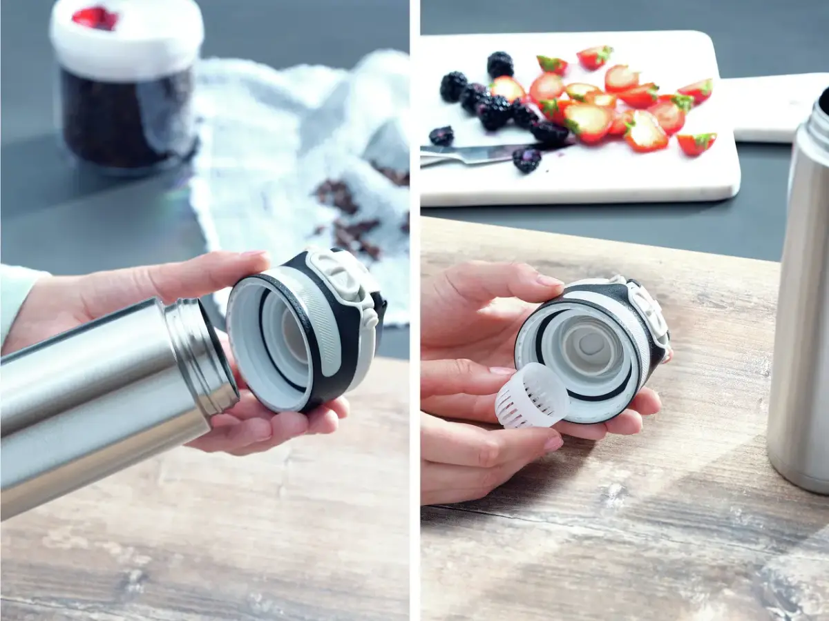 LEIFHEIT Flip thermal necklace - for those who want to enjoy their drinks on the go.The mug is 100% airtight and can be easily and conveniently opened in just one movement. The cap has an additional locking mechanism to prevent accidental opening: this means the mug can be safely carried in your bag.Equipped with a handy handle for easy carrying and attachment to a backpack or bag. A removable filter allows you to add herbs without disturbing your drinking. Thanks to the robust stainless steel body with vacuum insulation and double wall, drinks stay hot for up to six hours and cold for up to 18 hours.With its compact size,the LEIFHEIT Flip thermo mug is ideal for everyday use and fits easily into most coffee machines. The mug is made without BPA.Hermetic cap prevents liquid and heat leakageDurable body made of stainless steel with vacuum insulation and double wall.Handy handle for easy bottle carryingRemovable filterKeeps cold: up to 18hKeeps hot: up to 6hDishwasher safe
