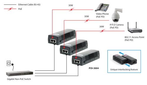 With the use of power injectors, DC power of up to 30W and the data that comes from a non-PoE switch are merged together and then transmitted to a PD such as a PoE network camera, through the Ethernet cabling. This allows you to extend the use of your existing hardware investment without needing to buy extra PoE switches.