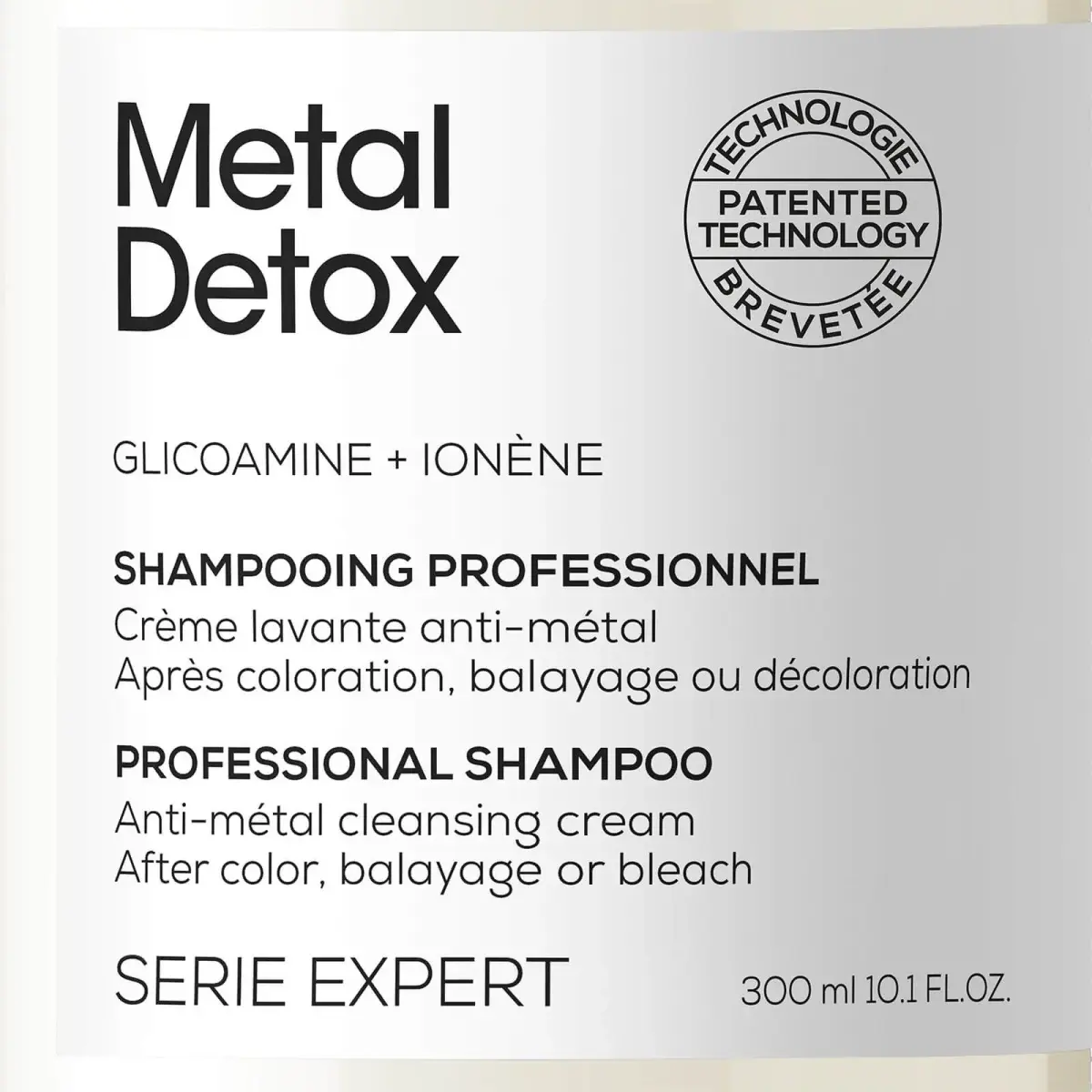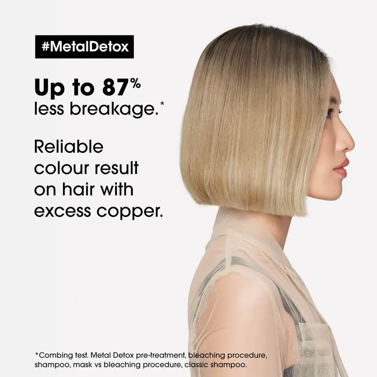 Protect hair from excess copper coming from water, with L'Oreal Professionnel Serie Expert Metal Detox Shampoo, this shampoo protects the fiber from deposits after any colour, balayage or lightening treatment. This rich, creamy unique shampoo helps maintain colour vibrancy, instantly smooths and softens hair resulting in nourished healthy locks. When you get the Metal Detox treatment in salon before colour followed by our care routine, enjoy the benefits of up to 87% less breakage** & reliable colour results. For optimal results, use after Metal Detox anti-metal cleansing cream shampoo. *Instrumental test after Metal Detox Shampoo + Mask up to next shampoo **Instrumental test: Metal Detox pre-treatment + technical procedure + shampoo + mask. | L'Oreal Professionnel Serie Expert Metal Detox Shampoo 300ml in Clear.