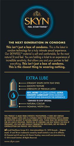 This product does not contain natural rubber latex and is a suitable choice for individuals with a known or suspected allergy to natural rubber latex. Some highly sensitive individuals may, however, experience allergic reactions to ingredients in these condoms. Should you experience a reaction please seek medical advice. Always read the label. Use only as directed.Manix SKYN Extra Lube. Type: Male condom, Surface texture: Smooth, Product colour: Transparent. Width: 53 mm. Quantity per pack: 10 pc(s). Doesn't contain: Latex