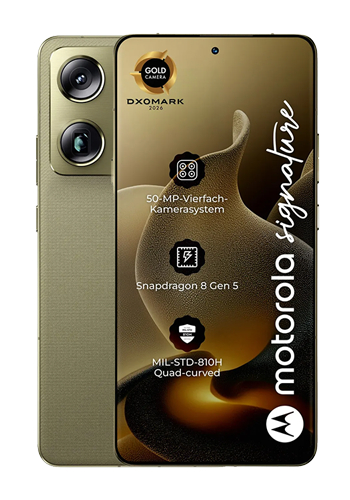 Signature 5G Die neue motorola signature-Serie definiert Perfektion neu mit einer ausgereiften Kombination aus Technologie und Design. Mit erstklassigen Kameras, exklusivem Zugriff auf personalisierte Luxus-Erlebnisse und vielem mehr ist es ein Statement der Präzision und Eleganz, ganz im Sinne der Motorola-DNA. Für alle, die das Außergewöhnliche suchen Einzigartige Eleganz Dein treuer Begleiter Smarter mit jedem Update Zuverlässige Sicherheit Immer informiert Innovation, die dich begleitet Die beste Kamera in einem ultraflachen Smartphone Zukunftsweisende Performance Präzise Fertigung. Innen und außen Power auf die du dich verlassen kannst Unverwechselbar modern Das aus Flugzeugaluminium gefertigte Design fühlt sich unglaublich leicht und dennoch robust an. Dieses kräftige, edle Marineblau in PANTONE Carbon hat eine tolle, matte Tiefe und eine leinen-inspirierte Textur, die eher Tradition als Trend ist. Es verbindet unauffälligen Luxus mit raffiniertem Minimalismus, wo auf jedes Detail geachtet wird. Ultraflach. Zukunftsweisendes Design. Ausgezeichnet mit dem DXOMARK Gold Label für hervorragende Bildqualität Unser bisher größter 50-MP-Sensor Der Sony LYTIA 828-Sensor der nächsten Generation mit 50 MP, Dolby Vision und moto ai sorgt bei jeder Aufnahme für Klarheit, Farbe und Kontrolle. Brillanz in jeder Distanz Von nahezu randlosem Ultraweitwinkel bis hin zu extremen Nahaufnahmen ? das 50-MP-Objektiv fängt jedes Detail mit moto ai Brillanz ein. Ausgezeichnete Auflösung auch bei Aufnahmen aus der Ferne Das 50-MP-Periskop-Teleobjektiv LYTIA 600 von Sony mit 3-fachem optischem Zoom und bis zu 100-fachem Super Zoom Pro mit moto ai sorgen für scharfe Aufnahmen aus der Ferne. Detailgetreue Aufnahmen. Unvergessliche Ergebnisse. Mehr Kontrast und deutlichere Schatten für Bilder mit Charakter. Erlebe schärfere, hellere und lebendigere Fotos dank der Photo Enhancement Engine, die aus jedem Objektiv das Maximum rausholt. Mehr Kontrast und deutlichere Schatten für Bilder mit Charakter. Erlebe schärfere, hellere und lebendigere Fotos dank der Photo Enhancement Engine, die aus jedem Objektiv das Maximum rausholt. Mach coole Action-Fotos mit einer cleveren Verschlusszeit und AI-verbesserten Details. Dramatische Aufnahmen voller Tiefe und Persönlichkeit, egal ob bei Tag oder Nacht. Mach Portäts in Studioqualität mit natürlicher Unschärfe und flexiblen Brennweiten. Kinoreife Videos für deinen Feed Der 50-MP-Sensor LYTIA 828 von Sony macht Aufnahmen in 8K mit Dolby Vision für unschlagbare Details, echt aussehende Farben und Bearbeitungsmöglichkeiten, die auch auf der großen Leinwand gut aussehen. Zoomen ohne Limits Das 50-MP-Periskop-Teleobjektiv LYTIA 600 von Sony mit 3-fachem optischem Zoom und bis zu 100-fachem Super Zoom Pro bringen auch weit entfernte Szenen perfekt in den Fokus. Aus Fotos werden animierte Videos Animiere deine Fotos und wandle sie ganz einfach in dynamische Videos um. Probier einfach mal verschiedene kreative Möglichkeiten aus, indem du mit unterschiedlichen Prompts und Kunststilen experimentierst. Einfach Google fragen Entferne Objekte, ändere Hintergründe, optimiere die Beleuchtung und vieles mehr, indem du Google Fotos einfach darum bittest. Sag Google einfach, was du ändern möchtest, und schon werden deine Änderungswünsche umgesetzt. Bequem entfernen Mit dem Magischen Radierer kannst du störende Elemente mit einem Fingertipp entfernen und mit der Verbergen-Funktion ablenkende Objekte unbemerkt in dein Foto einfügen. Erinnerungen ganz einfach durchsuchen Mit ?Google Fotos fragen? kannst du direkt in deiner Google Fotos-Bibliothek nach bestimmten Erinnerungen suchen oder Infos abrufen. Kein endloses Scrollen mehr durch deine Galerie. Mit ?Google Fotos fragen? findest du genau das, wonach du suchst. Ein Jahr lang spezielle Angebote Gönne dir die schönsten Erlebnisse Mit dem motorola signature kannst du individuelle Erlebnisse und exklusive Services in den Bereichen Reisen, Gastronomie, Wellness, Lifestyle und exklusiver Clubzugang freischalten. Weltweiter Support Du kannst auf individuelle Services und rund um die Uhr auf Unterstützung zugreifen, egal ob du unterwegs oder zu Hause bist, überall auf der Welt. Absolute speed. Limitless intelligence. The 3nm Snapdragon 8 Gen 5 Mobile Platform sets a new benchmark for performance and efficiency. 36 % mehr CPU-Leistung Die CPU-Architektur der nächsten Generation ermöglicht CPU-Geschwindigkeiten von bis zu 3,8 GHz, flüssigeres Multitasking und eine optimierte thermische Steuerung für schnelle und mühelose Aktionen. 11 % mehr GPU-Leistung Die verbesserte GPU sorgt für flüssige Bewegungen, echt aussehende Details und lebendige Farben. Genieße eine gleichbleibend hohe Bildrate, die jede Szene unglaublich real wirken lässt. 46 % mehr AI-Leistung Erlebe multimodale generative AI, die Sprache, Text und Bilder versteht. Die Qualcomm AI Engine sorgt für schnellere AI-Leistung4 und ermöglicht so eine nahtlose, intuitive Interaktion. Das erste Smartphone mit einem Kühlsystem aus flüssigem Metall mit Kupfergewebe Der Snapdragon 8 Gen 5 bietet starke und konstante Leistung dank ArcticMesh Cooling System, einem neuartigen Kupfergeflecht, das die Wärme besser vom Prozessor ableitet. Das atmungsaktive Gewebe sorgt zusammen mit der Flüssigmetall-Kühlung von Motorola dafür, dass das System bis zu 4,4 °C kühler bleibt als zuvor. Die mit 6.002 mm2 um 20 % größere Dampfkammer ermöglicht anhaltende Geschwindigkeit und kühleren Komfort und erfüllt damit die Anforderungen des mobilen Computings der nächsten Generation. AI, die für dich da ist Beeindruckende Bilder mit Gemini erstellen Erstelle beeindruckende Bilder mit Gemini. Verwandle deine Ideen ganz easy in visuelle Darstellungen, die mit ihren lebendigen Details und realistischen Ergebnissen überzeugen. Blitzschnell auf dem neuesten Stand Sag einfach ?Was gibt es Neues?? und moto ai liefert dir eine schnelle, angepasste Zusammenfassun