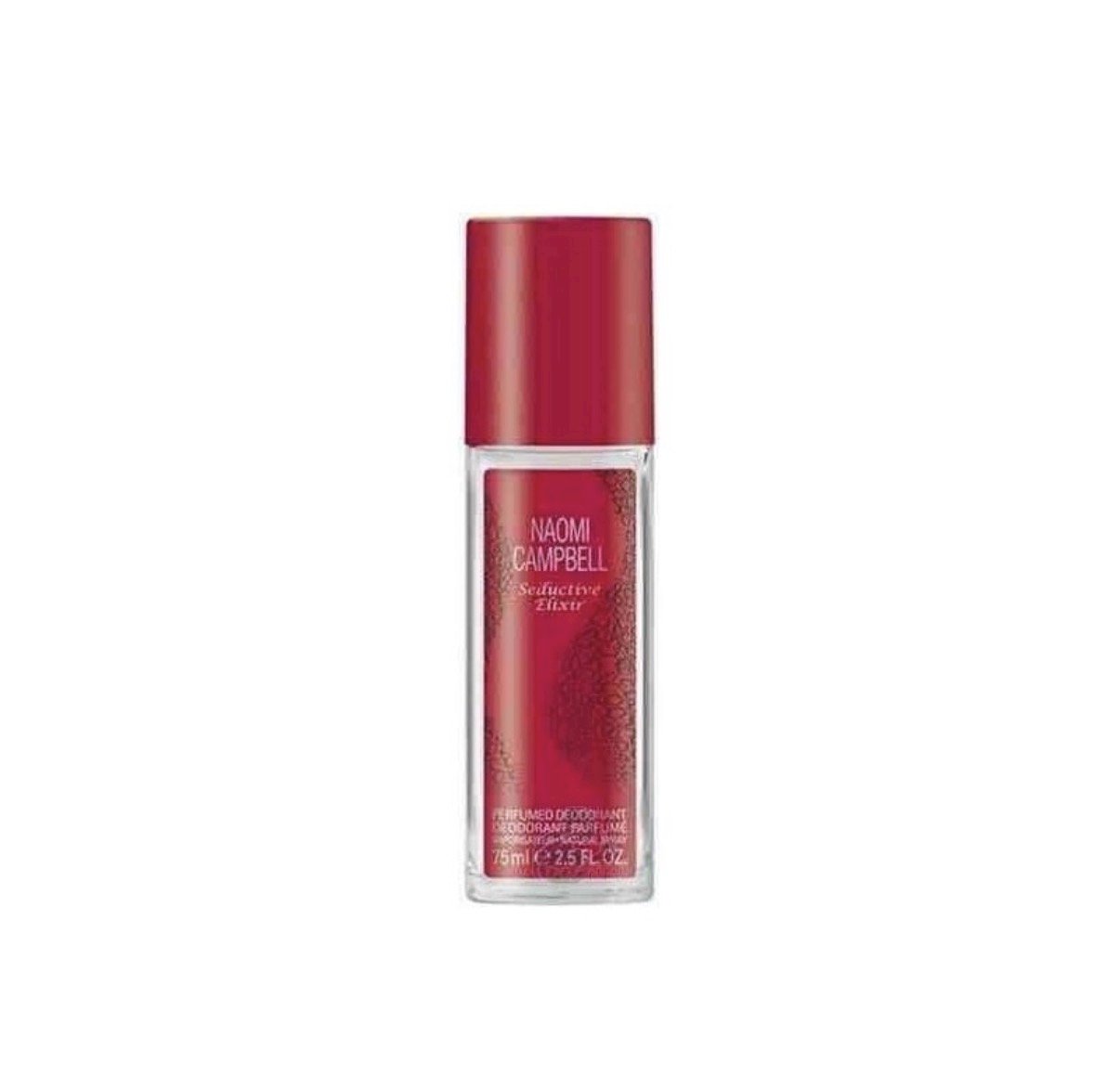 Naomi Campbell Seductive Elixir Deodorantspray 75ml on naiste deodorantsprey, mis sisaldab Seductive Elixir lõhna, ühendades värskeid puuvilja- ja vürtsikaid ülemisi noote granaatõuna, punase sõstra, roosa pipra ja paprika ning lillelisi südame noote freesia, hibiskuse ja violeti ning sooje põhjanooti musku ja sandlipuuga; toode tagab efektiivse kaitse ebameeldiva lõhna eest ja püsiva värskuse, jättes nahale meeldiva lõhna ning sobib igapäevaseks kasutamiseks