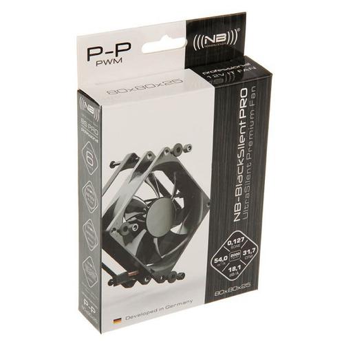 Noiseblocker BlackSilentPro P-P. Type: Fan, Fan diameter: 8 cm, Rotational speed (min): 500 RPM, Rotational speed (max): 2000 RPM, Airflow: 54 m³/h. Voltage: 12 V. Width: 80 mm, Depth: 80 mm, Height: 25 mm. Product colour: Black