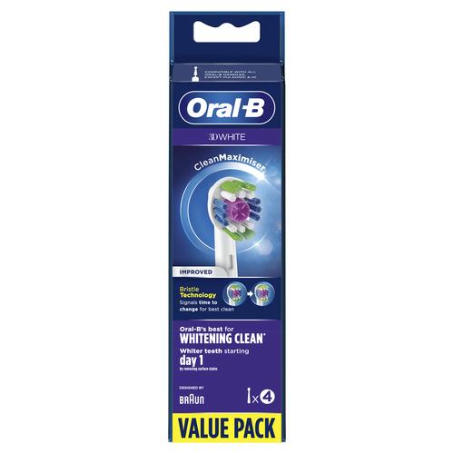 *vs. a regular manual toothbrush.Oral-B 3D White Replacement Brush Head with CleanMaximiser Technology, 4 pcs. Number of brush heads included: 4 pc(s), Product colour: White, Cleansing brush replacement(s) period: 3 month(s). Weight: 21.8 g. Package width: 18 mm, Package depth: 60 mm, Package height: 220 mm. Quantity per pack: 4 pc(s), Master (outer) case width: 126 mm, Master (outer) case length: 149 mm. Inner package quantity: 6 pc(s)