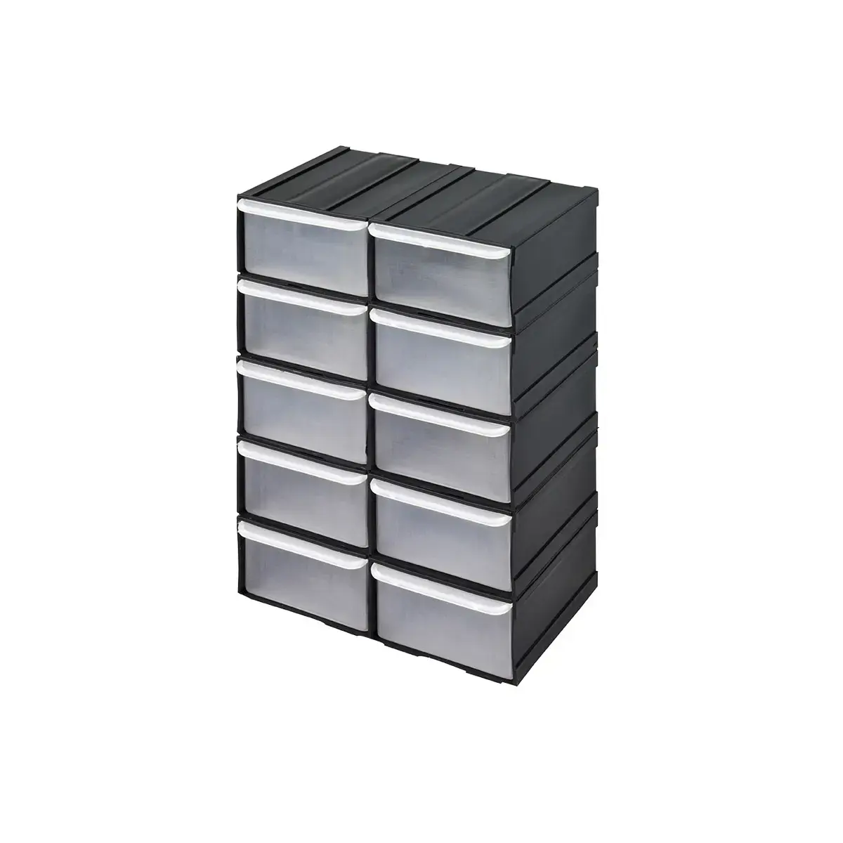Drawer unit with 10 drawers. The modular design allows you to upgrade and modify the basic set. Mounting holes allow the drawers to be fixed to the wall. Dimensions of the basic set 156 x 100 x 225 mm.
