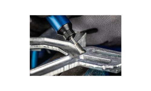 Cylindrical burr with radius end according to DIN 8032 with cut conforming to DIN 8033. Combination of cylindrical and ball-shaped geometries.