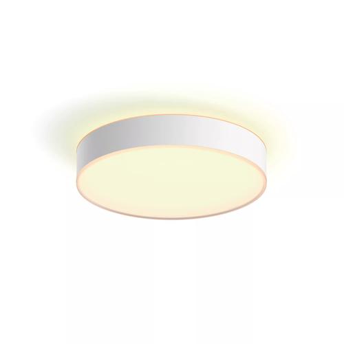 Get powerful, warm-to-cool white light in the bathroom with the medium Devere ceiling light in white. Brighten the room to apply make-up or get ready for work in the morning – or dim down low for a relaxing soak in the bath.Philips Hue White ambience Devere medium ceiling lamp. Type: Smart ceiling light, Interface: Bluetooth, Product colour: White. Energy efficiency class: F, Input voltage: 50–60 Hz, Bulb voltage: LED. Width: 381 mm, Depth: 381 mm, Height: 84 mm. Package width: 437 mm, Package depth: 457 mm, Package height: 100 mm. Quantity per pack: 1 pc(s)