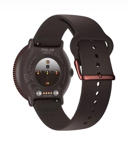 Polar Ignite 3. Display diagonal: 3.25 cm (1.28"), Display technology: AMOLED, Display resolution: 416 x 416 pixels, Touchscreen. Processor frequency: 192 MHz, RAM capacity: 5 MB, Flash memory: 0.032 GB. GPS (satellite). Battery capacity: 215 mAh. Weight: 21 g. Band material: Silicone, Band colour: Brown, Band size: M/L
