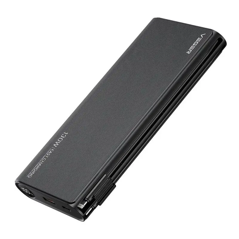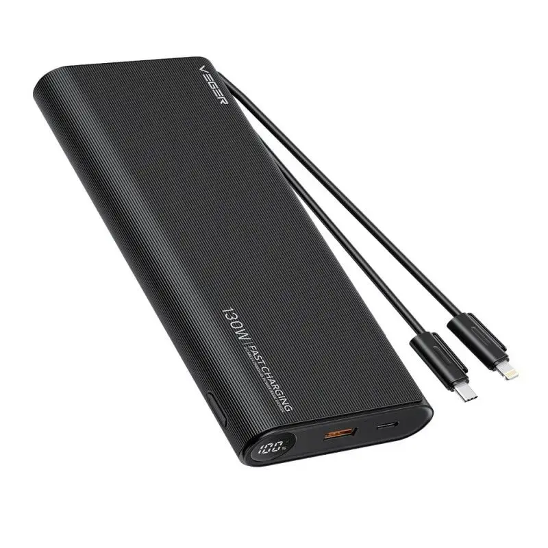 The Veger TCE130 (W2503) power bank with a capacity of 25,000 mAH is a guarantee of fast charging anywhere and anytime. It has 2 built-in cables with USB-C and Lightning. Power and efficiency in a compact form - The Veger Powerbank offers an impressive 130W power, allowing you to charge up to four devices at the same time. Featuring fast charging and a clear LCD display, this compact and lightweight power bank is the perfect travel companion. Fast and convenient charging: Thanks to the fast charging technology, your devices will be ready for use in a very short time. By choosing the version with the attached cable, you only need 2 hours to fully charge the powerbank, provided that you use the 60W PD charger and 60W PD cable. If you choose a model with a built-in cable, a 60W or higher charger will suffice. Compact design for active people: Its small size and lightweight construction make it easy to fit in any bag or backpack. The clear LCD display keeps track of the charge level, so you always know when it's time to top up. Versatility in your hands: With a 100W USB-C PD output, the Veger power bank is able to power most laptops on the market, including Macbooks, Dell series and other models with PD or PPS charging up to 100W. In addition, a dedicated cable offering charging power up to 30W is available for iPhone users. Specification: