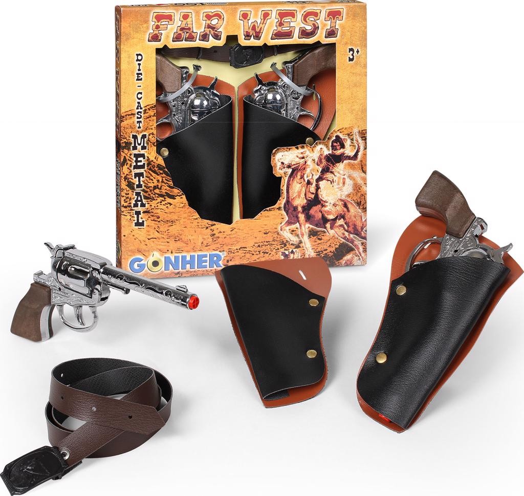 | Kirjeldus | Gonher kauboi komplekt 2 revolvrit ja vöö Kaks metallist kauboi revolvrit koos kabuuriga. Revolvrid 100 lasku vööl. Valmistatud Hispaanias. |