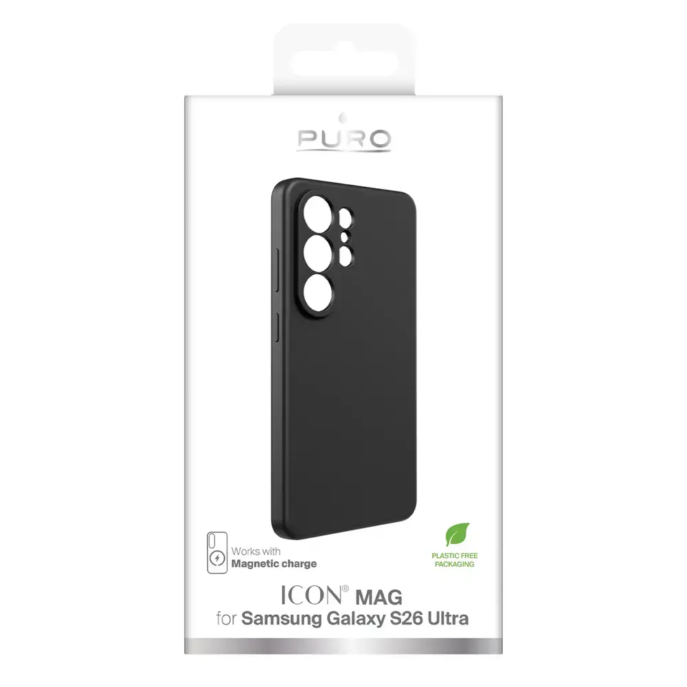 Puro ICON MAG Protective Case for Samsung Galaxy S26 Ultra Silicone Compatible with MagSafe - Black The Puro ICON MAG for Samsung Galaxy S26 Ultra is a high-quality silicone case with a built-in magnetic ring compatible with MagSafe. It enables fast and convenient wireless charging without having to remove the case. Made of liquid silicone with a soft-touch finish, it provides a secure grip and comfortable use. A microfiber-lined interior further cushions the device from shocks and bumps. Raised edges protect the camera, and the design ensures full access to all ports and buttons. ~ Specification: Brand: Puro Model: Puro ICON MAG Compatibility: Samsung Galaxy S26 Ultra Material: silicone, microfiber Color: black ~ The most important advantages of the Puro ICON MAG case: Built-in MagSafe-compatible ring: fast charging without removing the case. Soft-touch silicone: flexible and pleasant to the touch surface. Microfiber interior: additional protection against scratches. Raised camera frame: effectively protects the lenses. Full access to ports and buttons: ease of use without restrictions. ~ Magnetic charging compatible with MagSafe The built-in magnetic ring allows you to use MagSafe-compatible chargers without having to remove the case. Soft-touch silicone for maximum comfort Liquid silicone ensures a secure grip and comfort during everyday smartphone use. Microfiber protects the inside of the device A delicate lining inside absorbs shocks and protects the housing against micro-scratches. Raised edges protect the camera The frame around the camera module reduces the risk of scratches when placing the phone on hard surfaces. Full functionality without limitations The case provides free access to all keys, ports and functions of the Samsung Galaxy S26 Ultra.