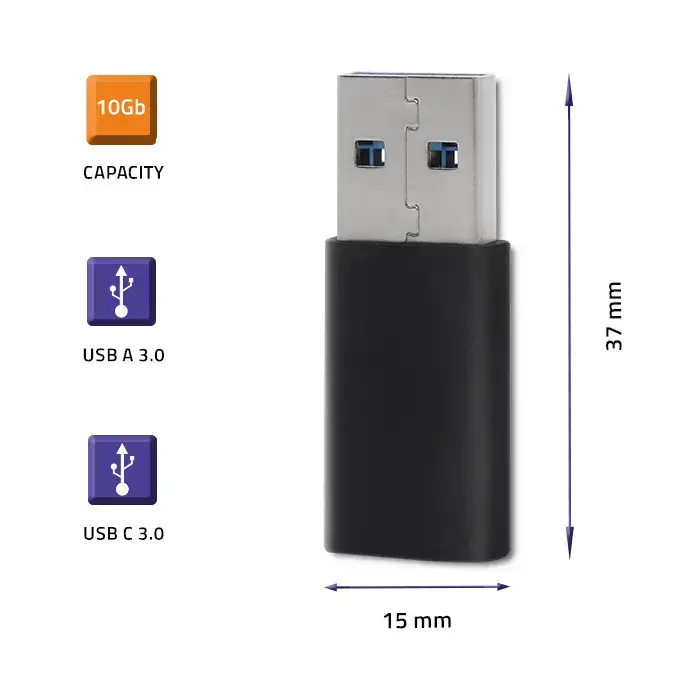 The adapter with USB type C and USB type A connectors allows you to charge and synchronize data in laptops, smartphones, tablets and electronic external accessories.