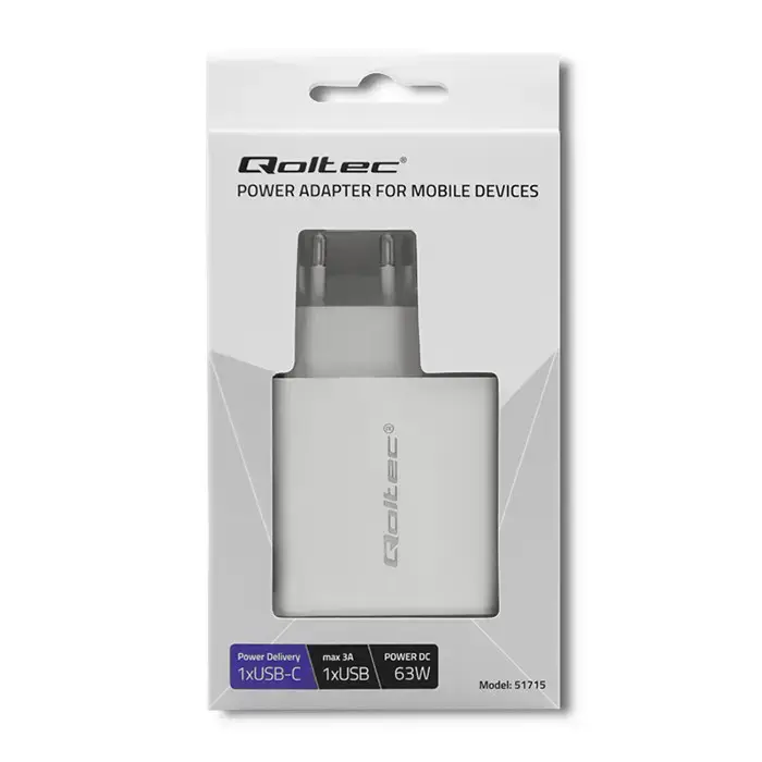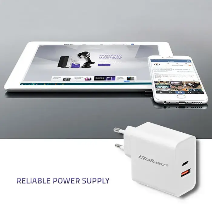 Qoltec charger is a guarantee of safe power supply and use. You can use it at home or at work. It has a number of protections to protect connected devices. It is characterized by high efficiency which reduces energy consumption. The presented model has: USB type C Power Delivery + USB QC 3.0 plug.