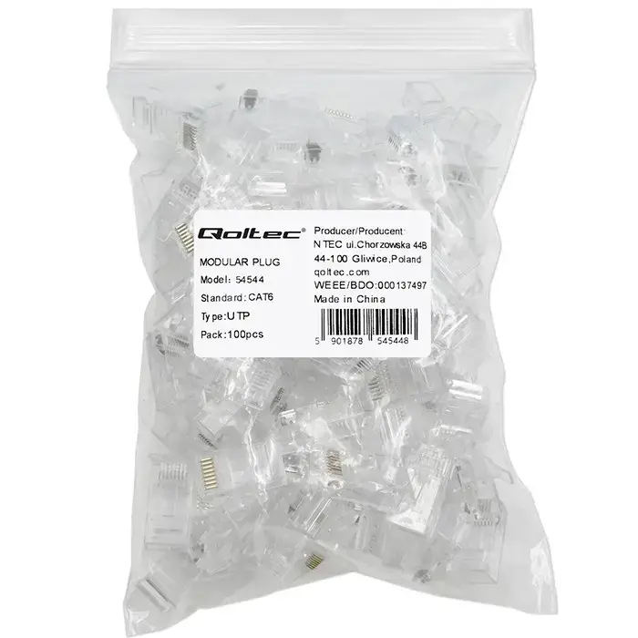 RJ45 connector commonly used to create connections in LANs, for connecting Category Cat6 unshielded Ethernet cables. The connector is made with the Pass Through system. It has 8 pins and gold-plated contacts. Set contains 100 pieces.
