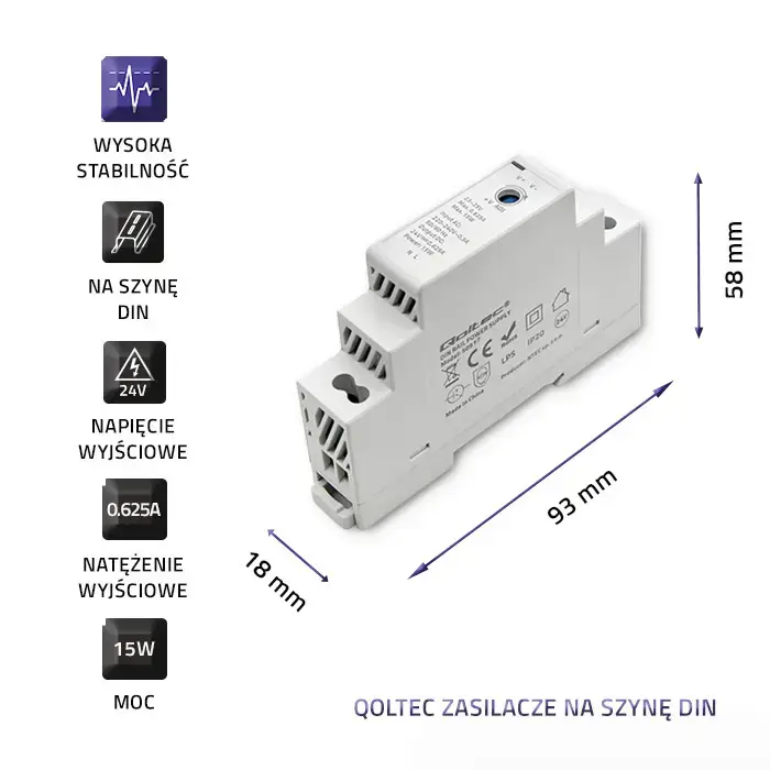 Qoltec SIINE rööpsu toiteallikas | 15W | 24V | 0.625A | Hall (5901878509174)