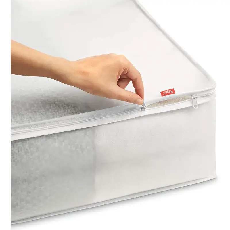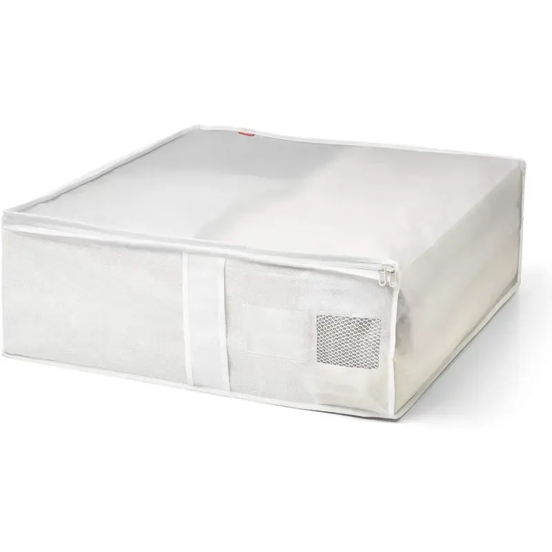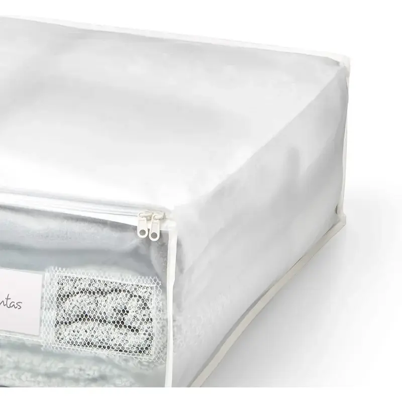 Blanket box made of PVA transparent material, double zipped, breathable mesh window.Ideal for storing clothes, blankets and dust protection.Size: 55 x 65 x 20cm