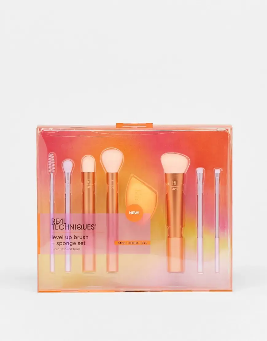 Face + Body by Real Techniques Next stop: checkout Contains eight brushes and a makeup sponge Synthetic bristles Use the Level-Up Brush + Sponge Set with eye shadow, highlight, bronzer, contour, blush, liner, and foundation Each brush can be used with liquid, cream, gel, and powder products Designed for long-lasting makeup application Presented in a branded box Product is non-returnable for hygiene reasons.